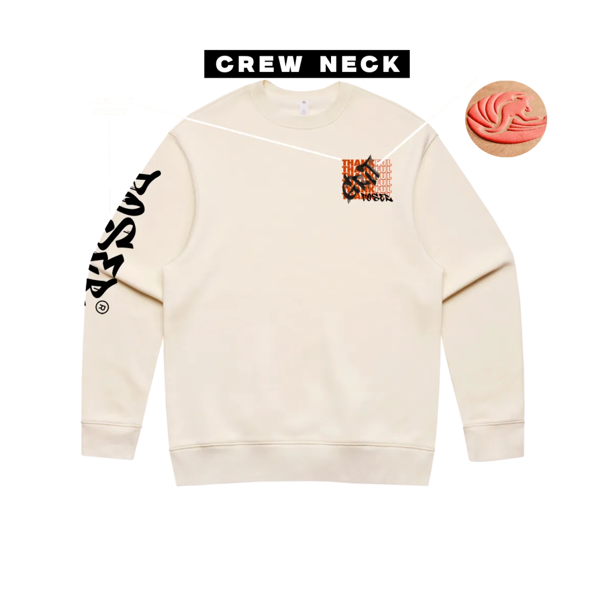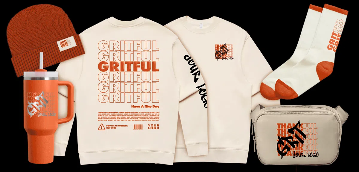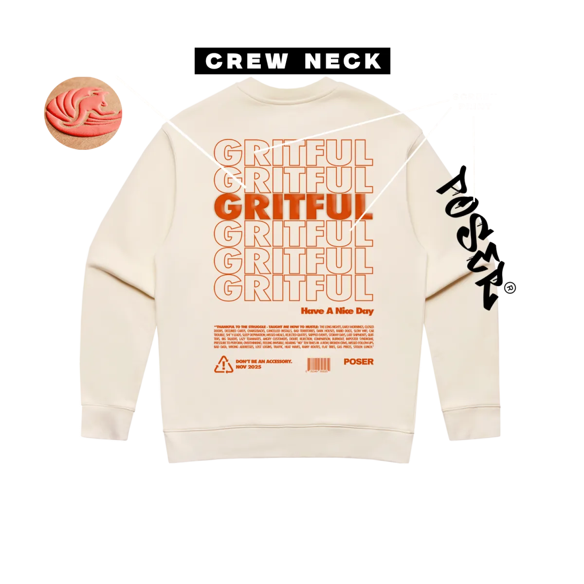 The centerpiece: a heavyweight crewneck that flips the iconic “Thank You” bag design into a battle cry — GRITFUL / GRITFUL / GRITFUL — a nod to the hustle, not the handout.